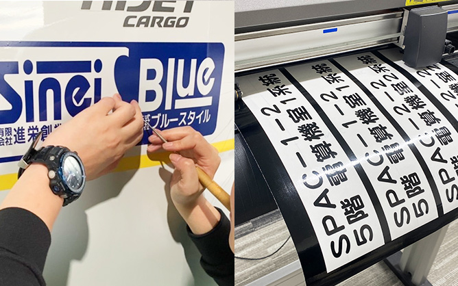 工場内の表記用カッティング文字や会社ロゴのデザインステッカーなど、各種制作しております。