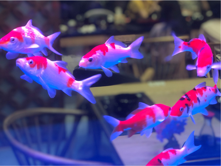 錦鯉が泳ぐアクアリウムがお店のシンボルです。